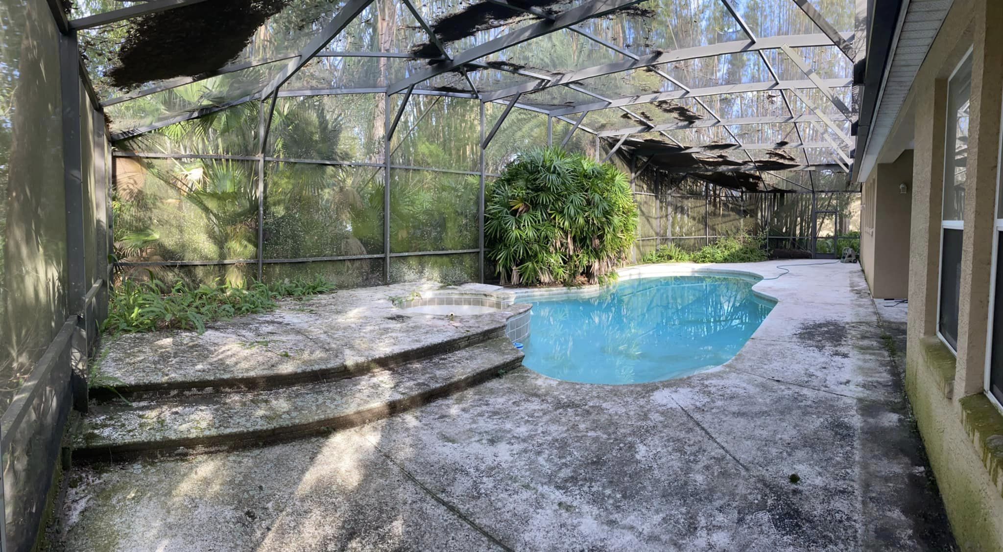 - Initial Inspection: We assess the pool deck and screen enclosure, identifying areas with heavy buildup or stains to determine the most effective cleaning approach.